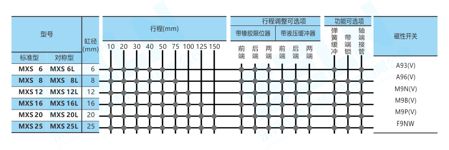 緩沖:橡膠緩沖(標(biāo)準(zhǔn))、液壓緩沖器、金屬限位器